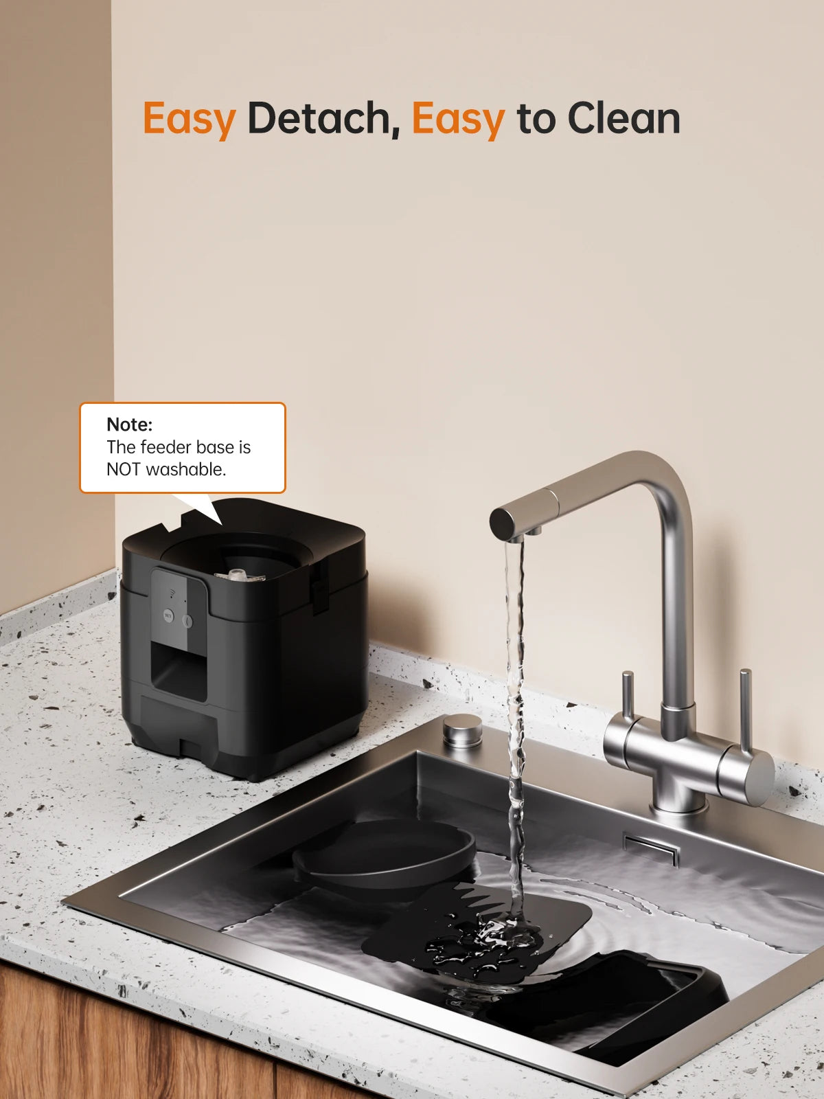 Easy to Detach and Clean: The food tank of the dog food dispenser is removable and can be cleaned with water, ensuring that your pet enjoys fresh, healthy meals. Note: The cat feeder base cannot be washed directly with water. You can use a cloth to wipe the base when needed