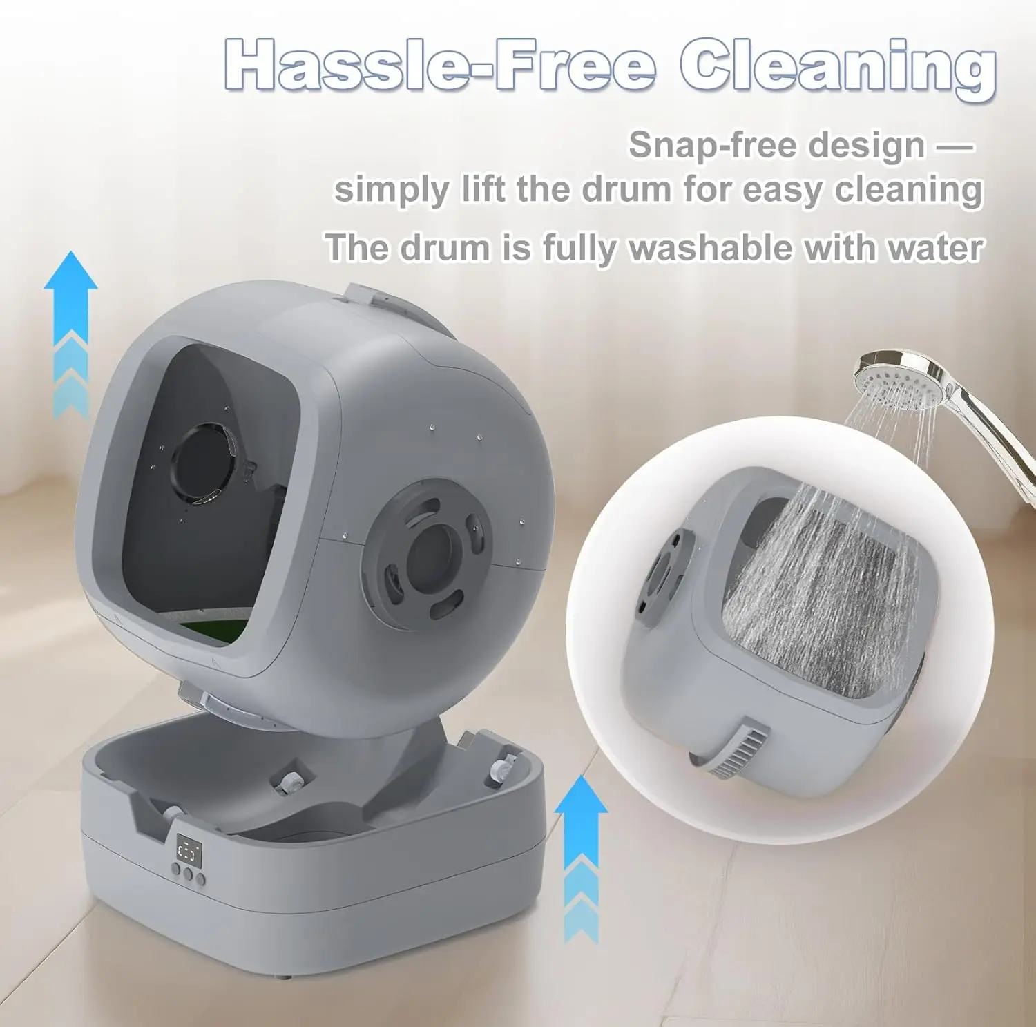 This automatic cat litter box is designed to provide a clean and convenient solution for your feline friends. Ideal for medium-sized cats and kittens, it ensures a hygienic environment with minimal effort from you. Key Features: - **Perfect Fit for Medium Cats**: Specifically sized to accommodate medium-sized cats and kittens, making it suitable for households with one or multiple pets. - **Ultra-Quiet Operation**: Operates at noise levels below 35 dB, comparable to a whisper or refrigerator hum, ensuring a peaceful home atmosphere without disturbing your pets or family. - **Smart App Integration**: Connect easily via 2.4GHz Wi-Fi or Bluetooth to monitor your cat's health in real-time. Track detailed usage history including weight, time spent in the box, and frequency of use through the intuitive app interface. - **Easy Maintenance**: Designed for straightforward cleaning—simply lift the drum for quick access. The drum is fully washable with water, allowing you to maintain hygiene without complicated steps. - **Assembly Required**: This product requires assembly, which typically takes about 30 minutes. For smooth setup, we recommend watching the provided assembly video and reading the user manual beforehand. Note: We also offer an assembly-free version in our store if preferred. Benefits: - Enhances pet comfort by keeping the litter area clean automatically. - Saves time and reduces manual cleaning tasks. - Provides health insights through smart monitoring features. - Ensures safety with anti-pinch design and quiet operation. Ideal for busy pet owners seeking a reliable and efficient litter management system. Enjoy peace of mind knowing your cat's needs are met with this advanced automatic litter box.