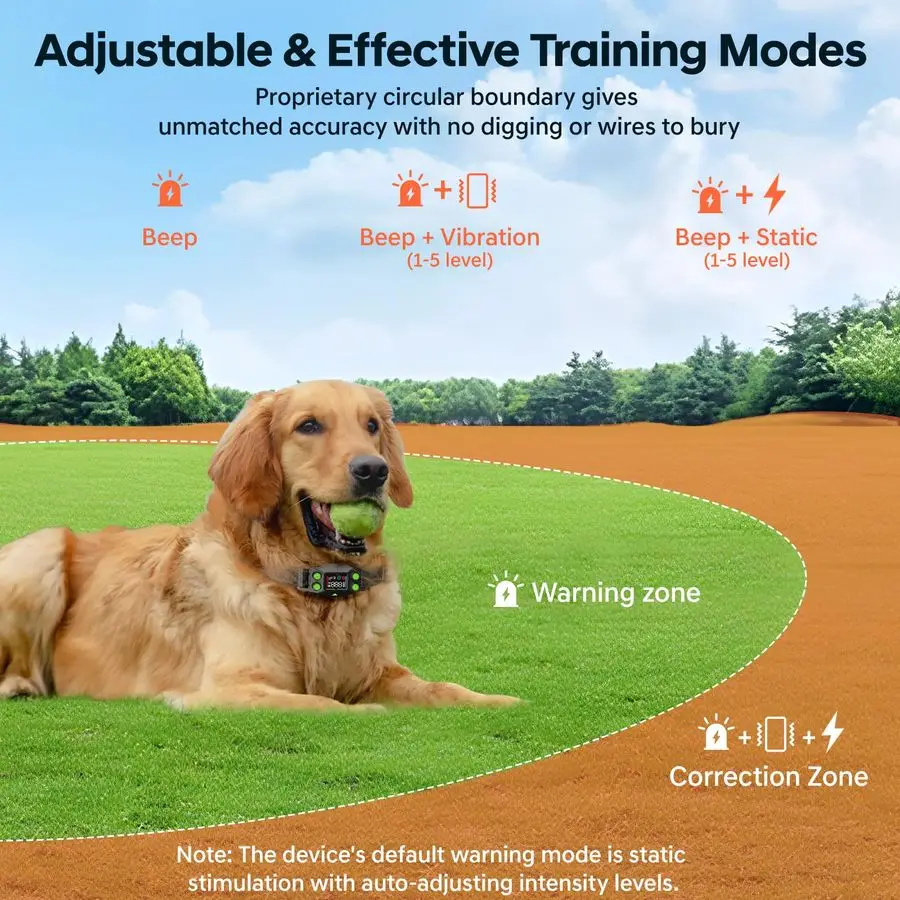 Secure Correction amp Boundary Customization Wireless dog fence system using progressive safety training, it provides reliable warning prompts beep vibration level 15, adjustable static level 15. Effective training of pets to stay away from the boundary, while ensuring maximum safety and comfort. Customized safety radius 25999 yards, covering an area of 650 acres, meeting the needs of outdoor scenes such as farms beach camping wilderness