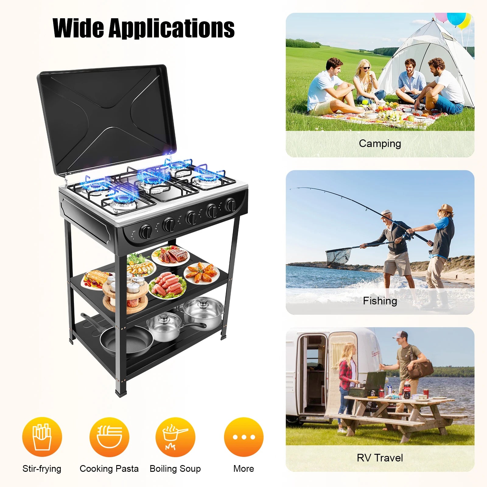 This natural gas stove with 5 burners is suitable for stir-frying, cooking pasta, boiling soup, etc., and is suitable for outdoor activities such as camping, fishing, RV travel, and emergency preparedness.