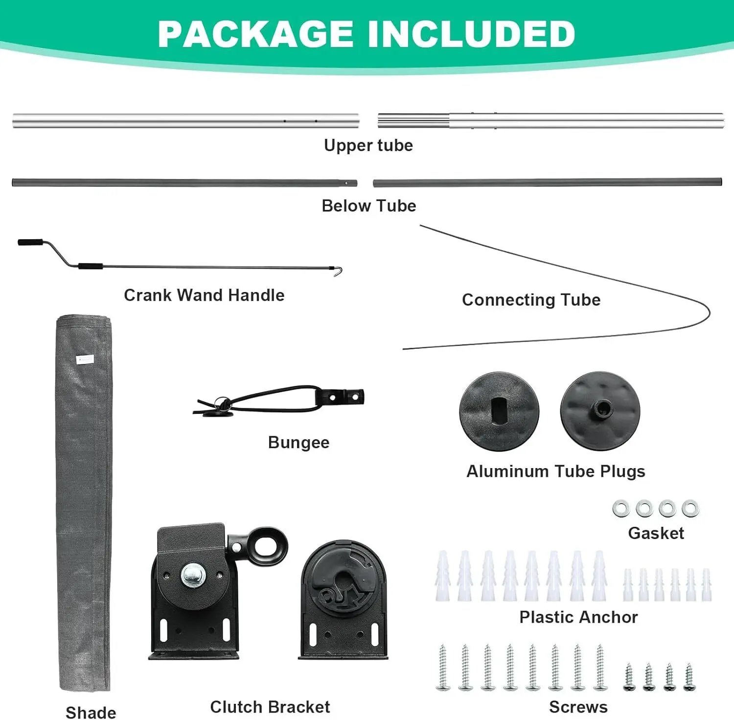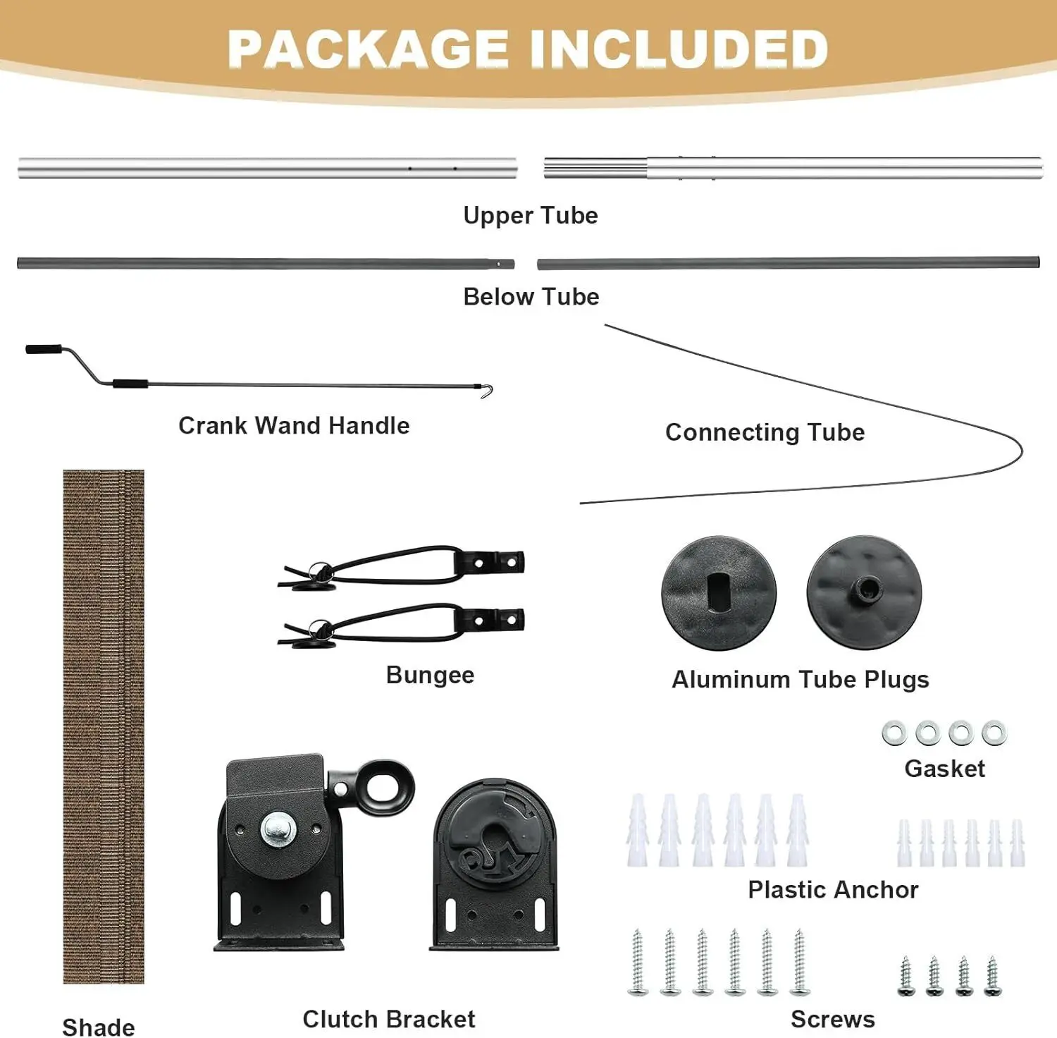 Complete Installation Kit: The roller shade includes everything you need for a smooth installation, featuring a crank wand handle, upper and lower tubes, shade, bungees, clutch brackets, screws, plastic anchors, gasket, tube plugs, and a detailed guide. Whether you're mounting it on a wall or ceiling, setting up your outdoor or patio roller shade is made simple and hassle-free.