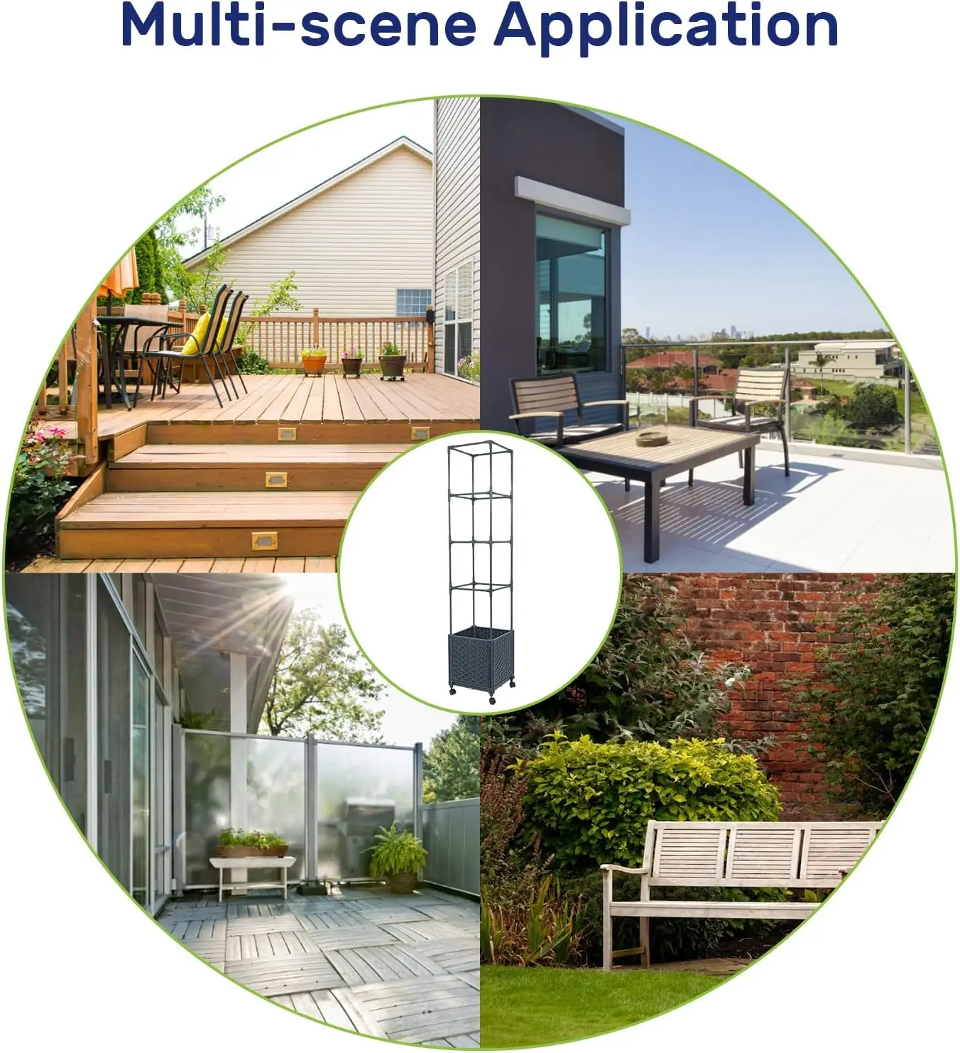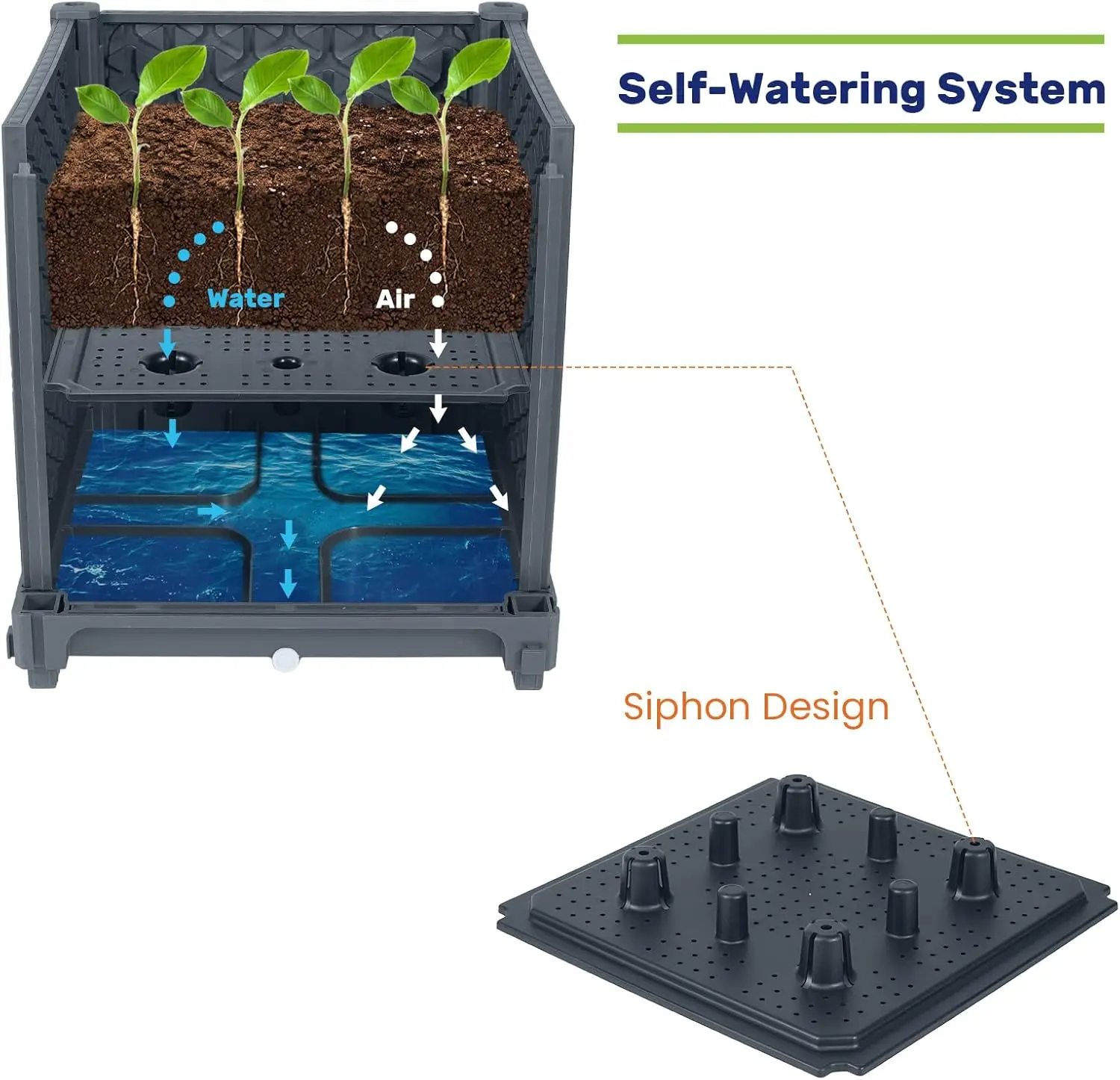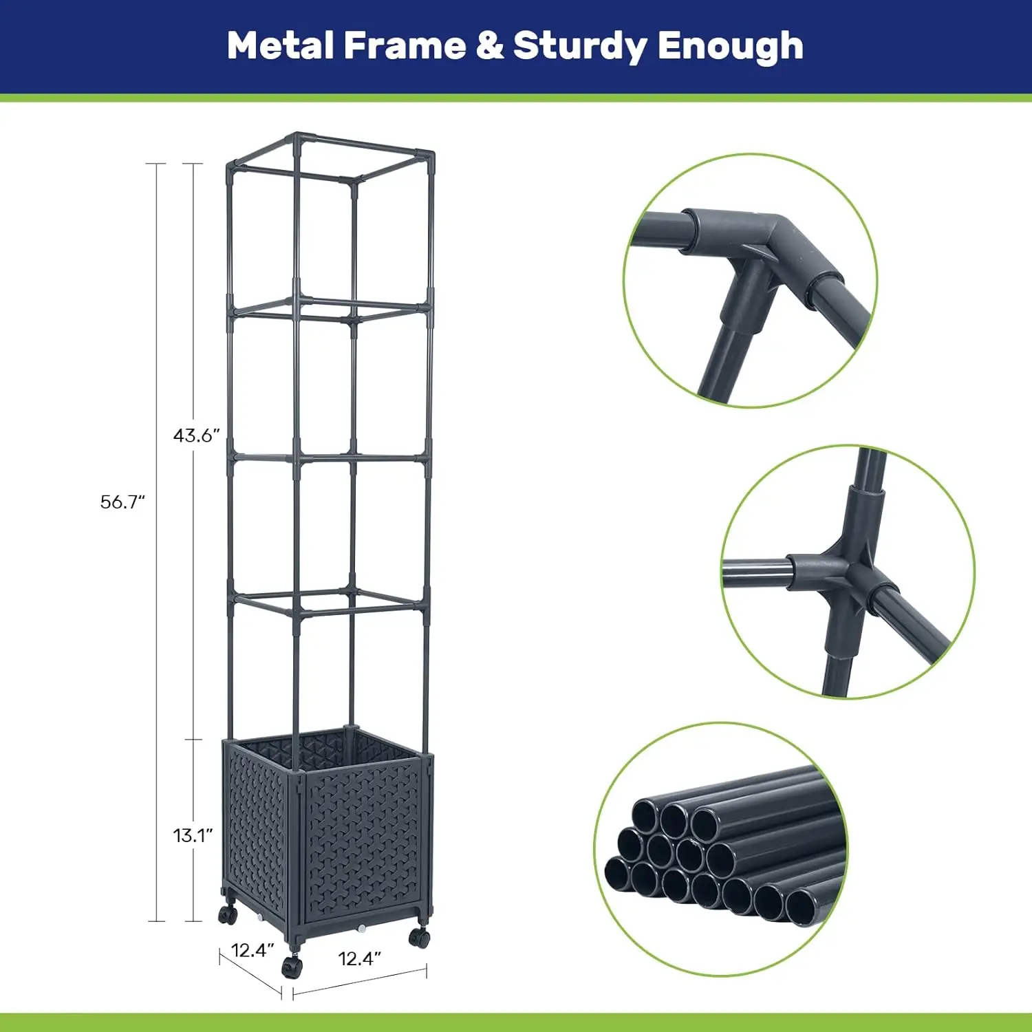 Enhance your outdoor space with this versatile raised garden bed planter box. Key features include: 1. Sturdy Trellis Support: The planter comes with a 43.6-inch trellis on top, providing excellent support for climbing plants like tomatoes, vegetables, and vine flowers. This eliminates the need for constant staking and tying while adding a decorative touch to your garden or patio. 2. Self-Watering Reservoir System: Enjoy convenience with the built-in self-watering feature that automatically absorbs and irrigates water to keep plants hydrated for several days. Four drainage holes help prevent root rot by effectively draining excess water. 3. Durable All-Weather Construction: Made from fade-proof and food-grade safe reinforced PP material, the planter box is designed to withstand various weather conditions. The trellis frame is constructed from sturdy alloy steel for long-lasting durability and minimal maintenance. 4. Easy Mobility with Lockable Casters: Equipped with four lockable swivel casters, this planter can be effortlessly moved around your garden, yard, patio, deck, or balcony to optimize sunlight exposure or provide shade as needed. 5. Simple Assembly and Expandability: Assemble this garden bed quickly without any tools or special skills in just minutes. The detachable and expandable design allows you to customize the setup by adding or removing trellis sections or combining multiple units to fit different spaces. 6. Reliable Quality Assurance: Backed by a commitment to quality, this product is built to last and comes with assurance of durability for peace of mind in your gardening endeavors.