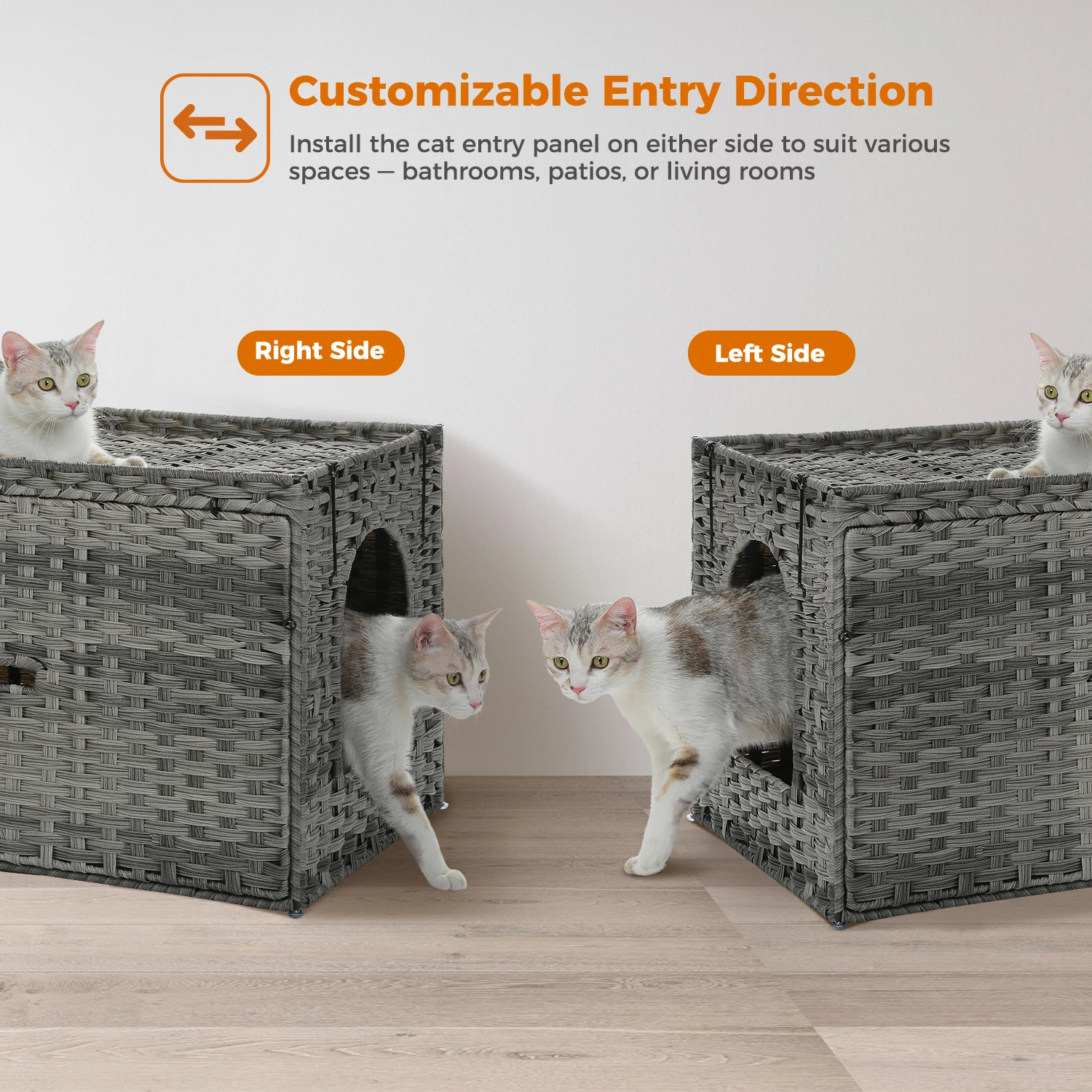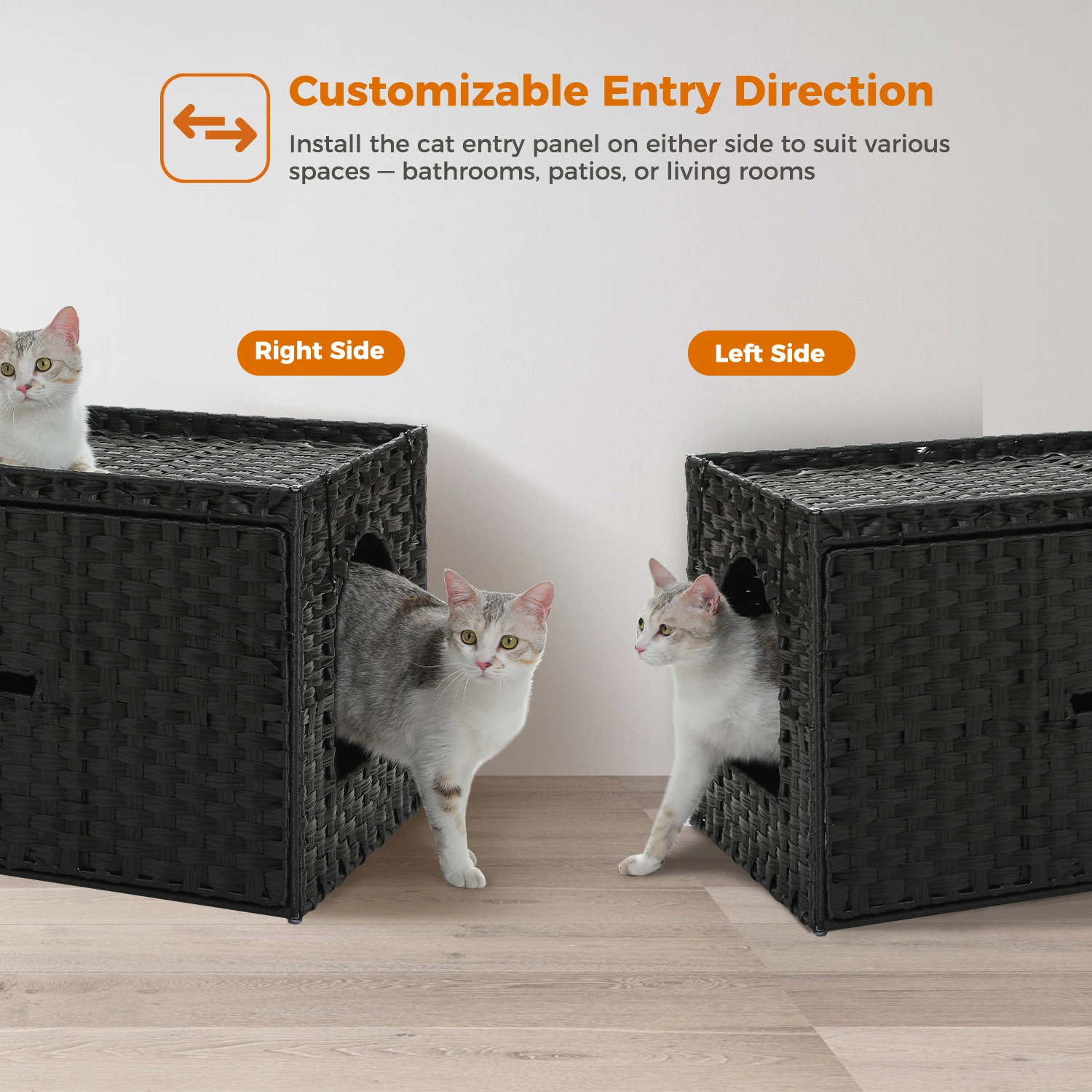 3.Reversible Entrance + Flexible Placement: Adapts to Any Room Layout,Customize the enclosure’s layout with a reversible left/right entrance panel to fit snugly next to sofas, beds, or corners. Use it as a functional side table in living rooms, a nightstand in bedrooms. Update Highlights: Flip up Design with 2 Safety Hinges,The lid can be opened at up to 180°. Open and close softly and smoothly. Make your daily care effortless.