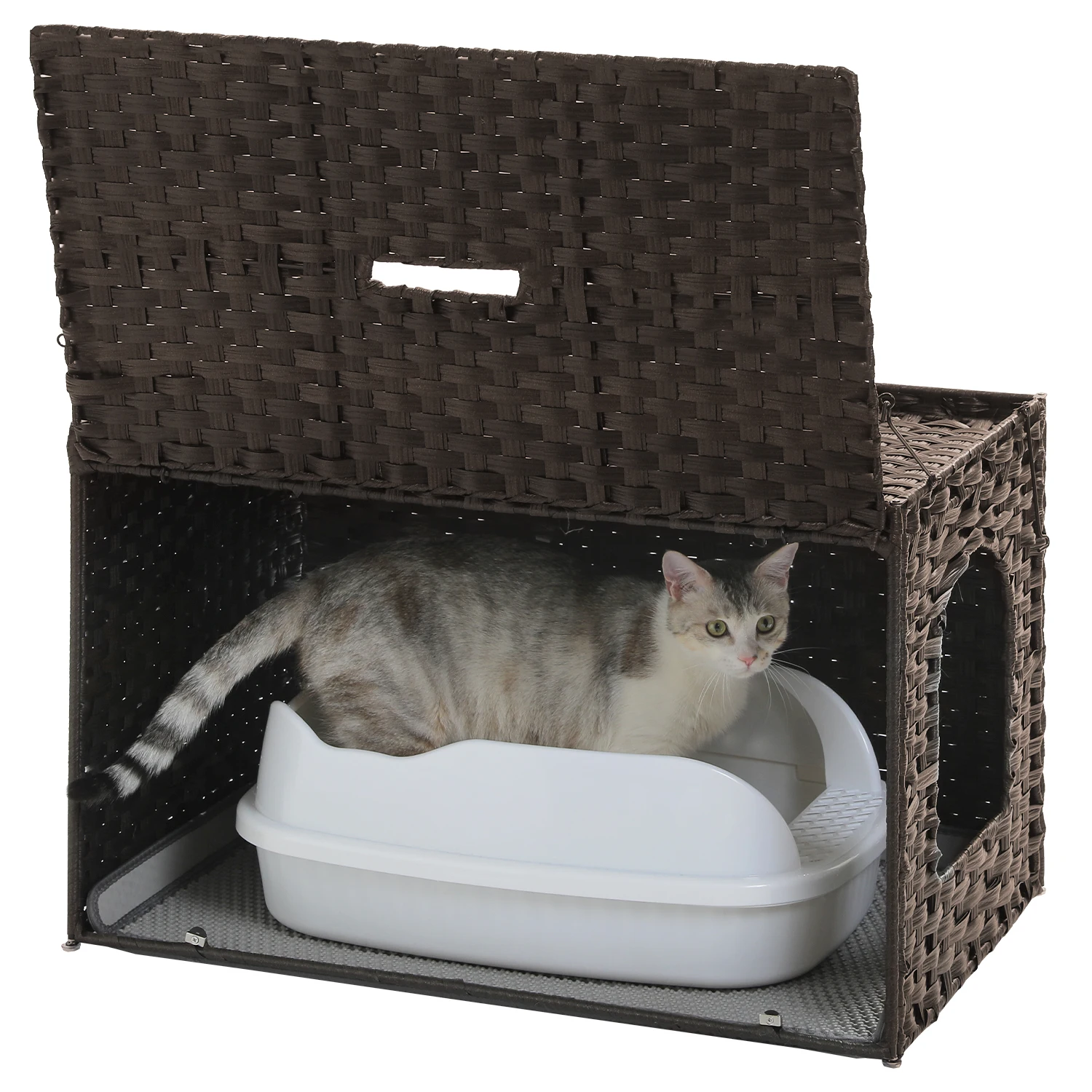 Rattan Cat Litter Box Enclosure with Taller Doorway and Flip-Up Design-More Space Raised Edge Mat-Cat House Cabinet Furniture